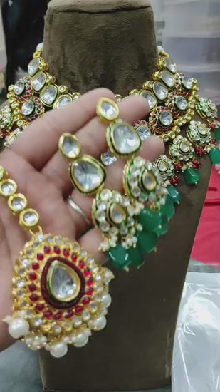 Bridal Kundan Necklace Set with Green Beads, Red Stones & Earrings