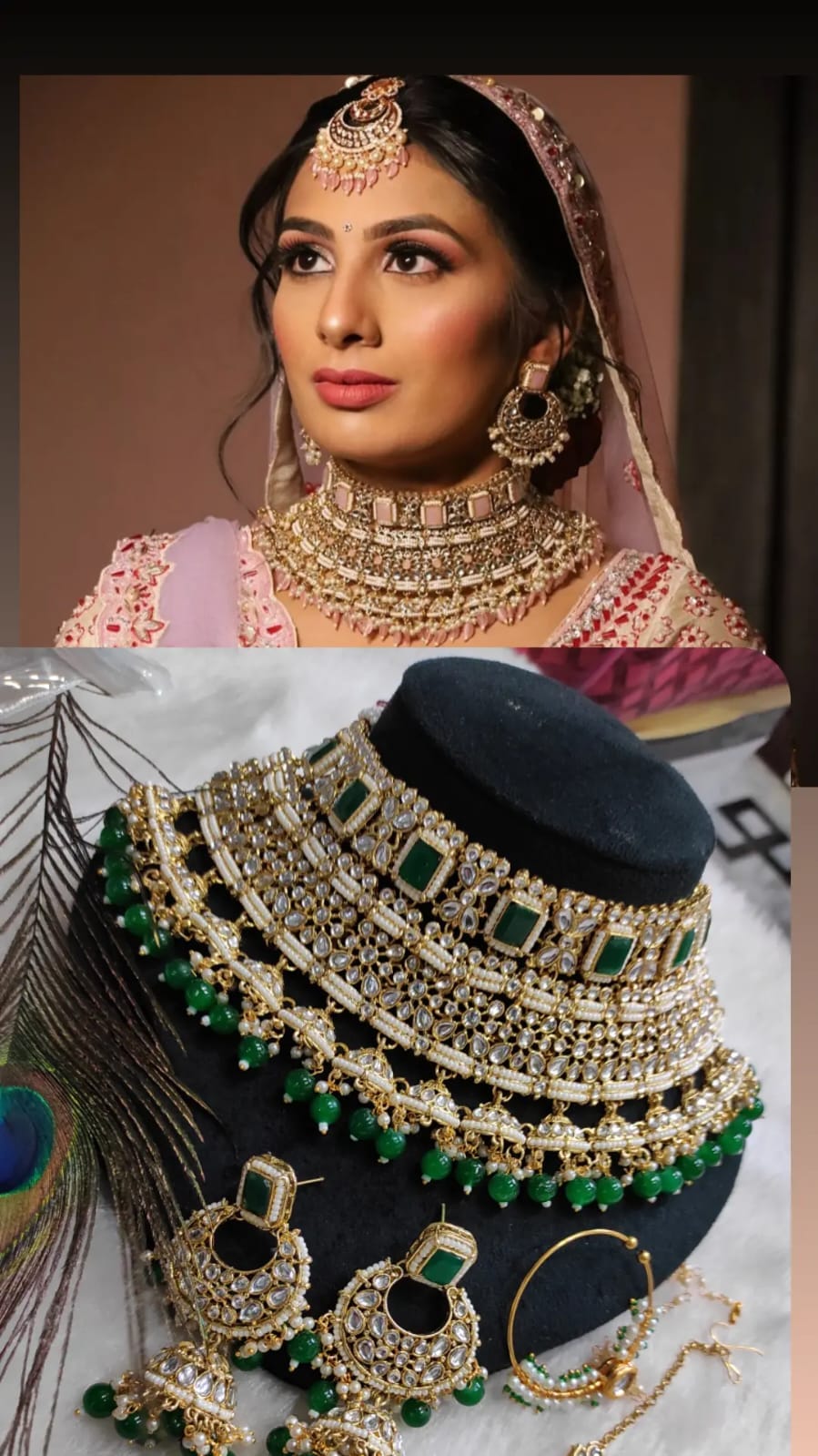 Elevate your bridal look with our Luxurious Dark Green Kundan Jewelry Set. This stunning set features a meticulously crafted necklace, matching earrings, and a maang tikka, all adorned with exquisite dark green Kundan stones. Ideal for weddings, festive occasions, and special events, this heavy jewelry set combines traditional craftsmanship with modern elegance. The intricate detailing and vibrant dark green hues make it a standout piece, ensuring you shine on your special day. Add this timeless set to your jewelry collection and embrace the rich heritage of Kundan artistry.
